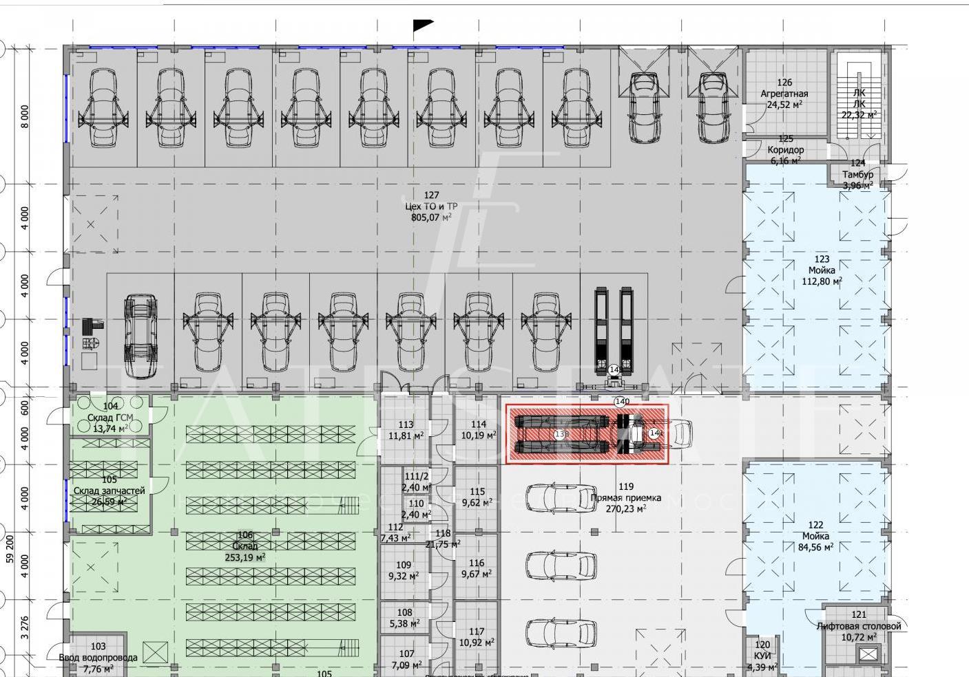 Далее: зона технического обслуживания на 17 постов, зона автомойки и детейлинга, зона выдачи авто, зона подготовки, склад, слесарка, раздевалки, зона приема пищи, офисы