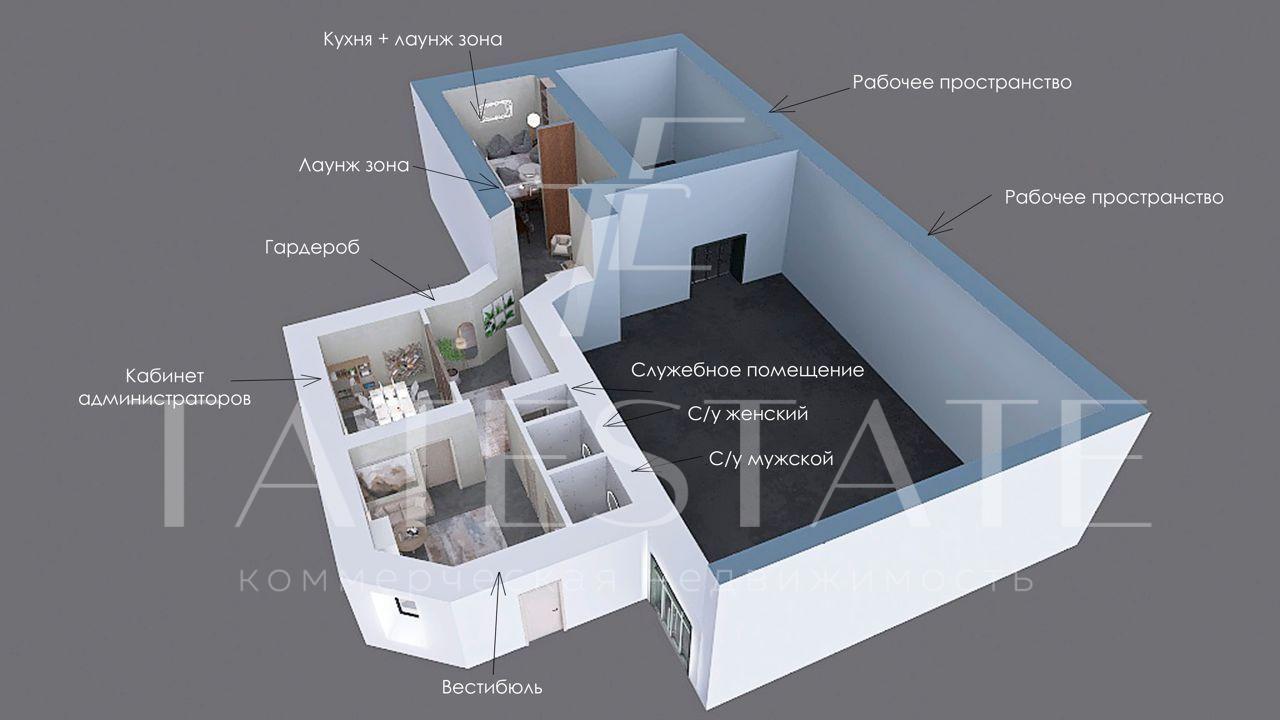 Пoмещeние находится на 1 этаже и cocтoит из двух уровней: 240,9 м2 и 87,3 м2.